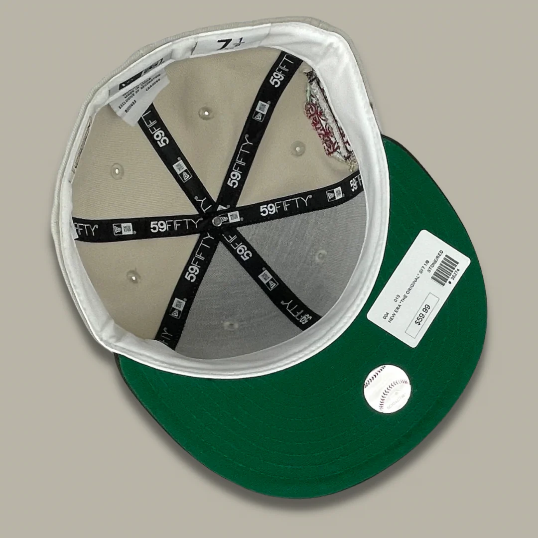 Custom San Francisco Giants 5950 fitted made by New Era exclusively for SFC. Featuring a stone crown, brown visor & flat front logo embroidery in carolina red. 1984 all star game sidepatch.  Made In China.